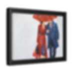 This framed matte canvas brings a cinematic, rain-soaked moment to your wall. Two figures walk arm-in-arm beneath a red umbrella — the lacquered reds and deep navy blues sit sharp against the soft, misty background. The black pine frame gives the piece a modern gallery edge while the textured matte canvas absorbs glare and keeps the brushstrokes feeling tactile. Hang it in an entryway to set a romantic, evocative tone or place it above a sofa to anchor a cozy living room vignette.